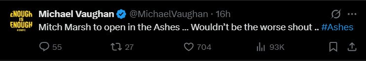 Inevitably, after my criticism last week, Mitchell Marsh has found some form. Clearly, he reads this newsletter!