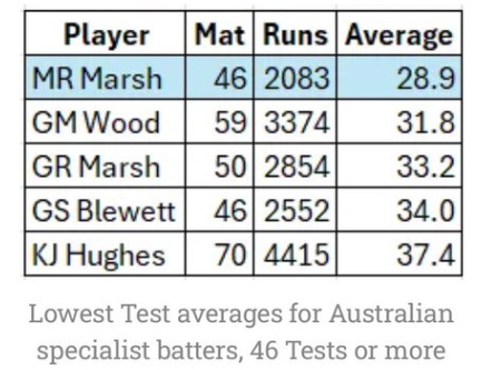 Of players who have played at least as many Tests, no Aussie batter has an average lower than Marsh.