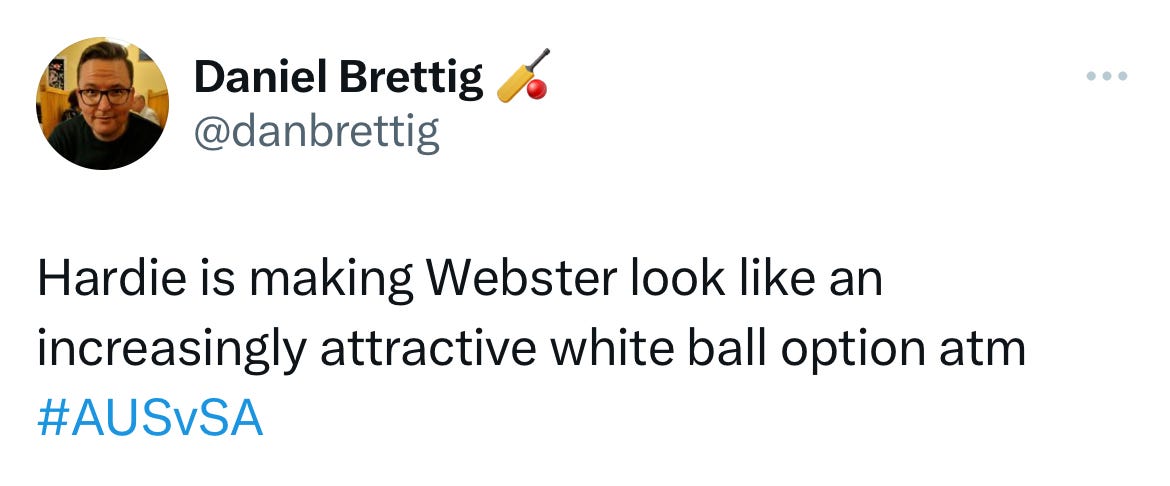 Hardy, Abbott, Dwarshuis and others are all okay but I can’t see them in the side for the 2027 World Cup. I can see Webster there though - they should give him a go!