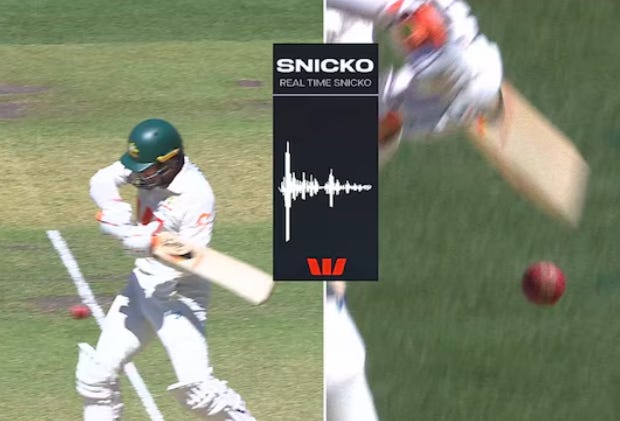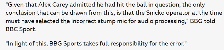 Snicko was embarrassing this week. It is diabolical that a human operator loaded the bowler’s end stump-cam audio (rather than the batter’s end) and as a result (because sound travels more slowly than light) the spike for Alex Carey’s nick appeared a few frames early, leading to his being given not out.