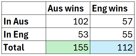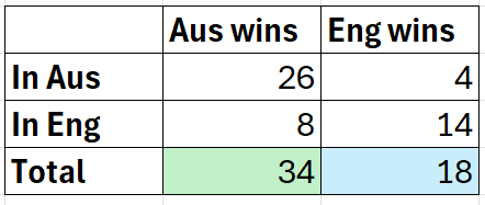 With that all in mind, let’s look at the overall Test match record between the two sides, for all Tests, including the 16 non-Ashes ones.