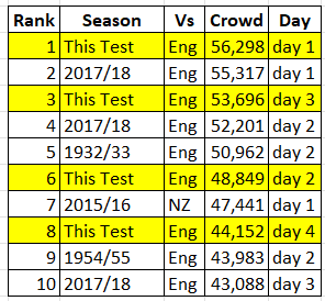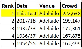 And the total crowd for the Test blew the old record out of the water. Bodyline is now down in third and the Ashes that followed it (1936/37), when Bradman dragged Australia to a 3-2 win, is now fourth.