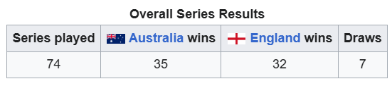 Futhermore, two series that Australia won handsomely (1881/82 and 1979/80) don’t count to the Ashes, and in the 3-Test series that England won 2-1 in 1882/83 a fourth Test was played - which Australia won - but it does not count to the Ashes.